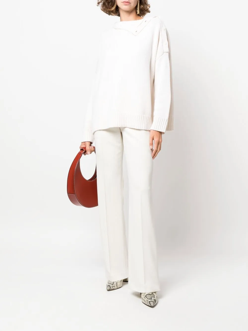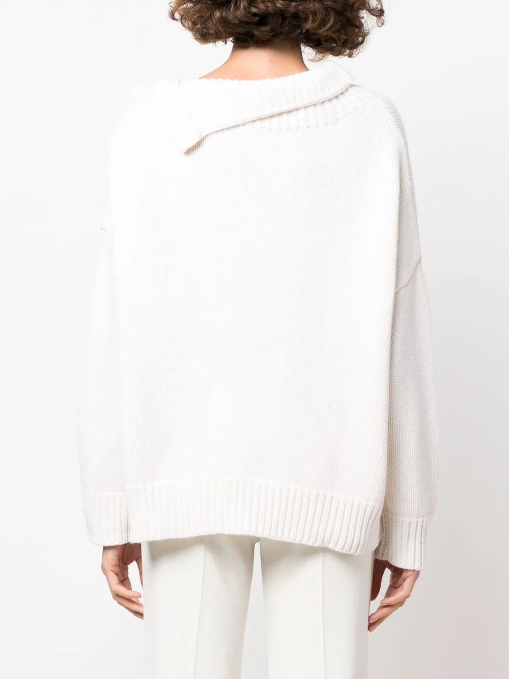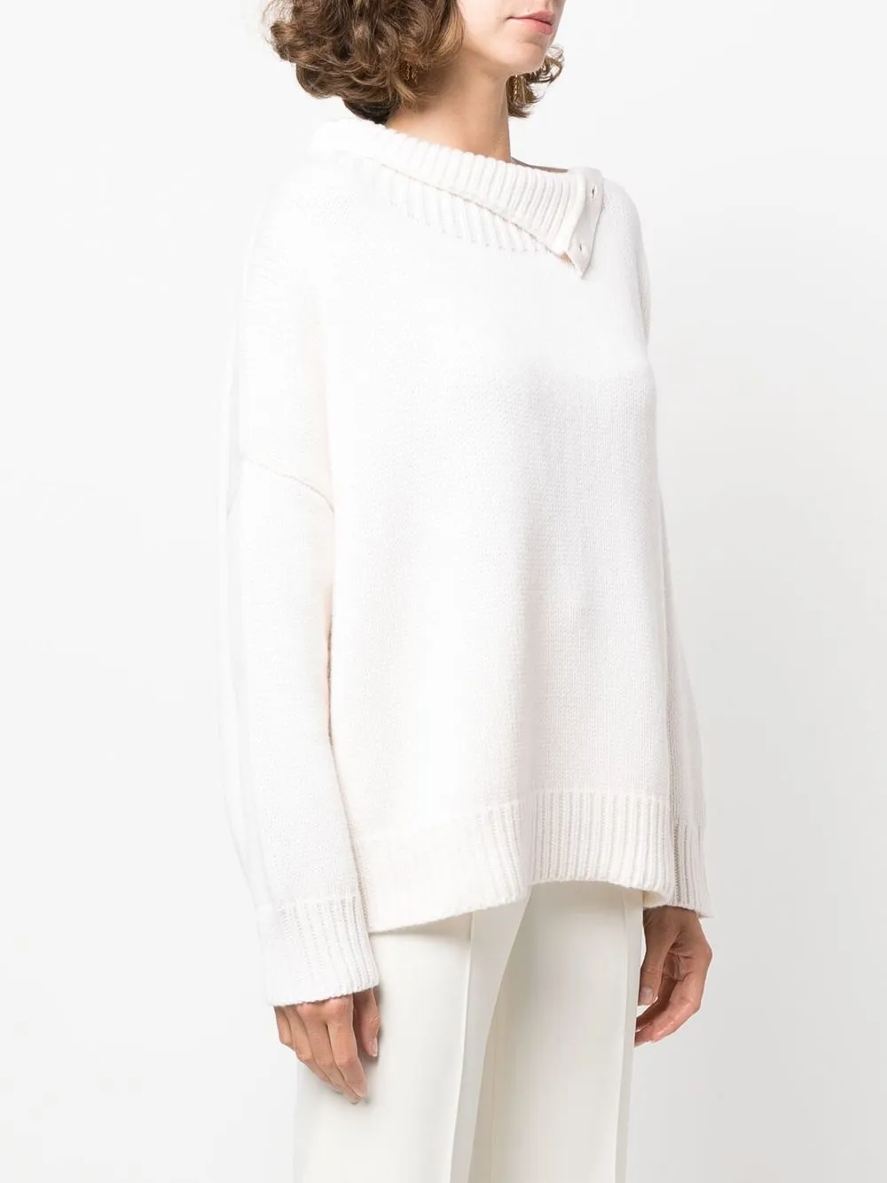 Bianco ottico, bordo con lavorazione a coste, collo largo, maniche a spalla bassa e maniche lunghe.