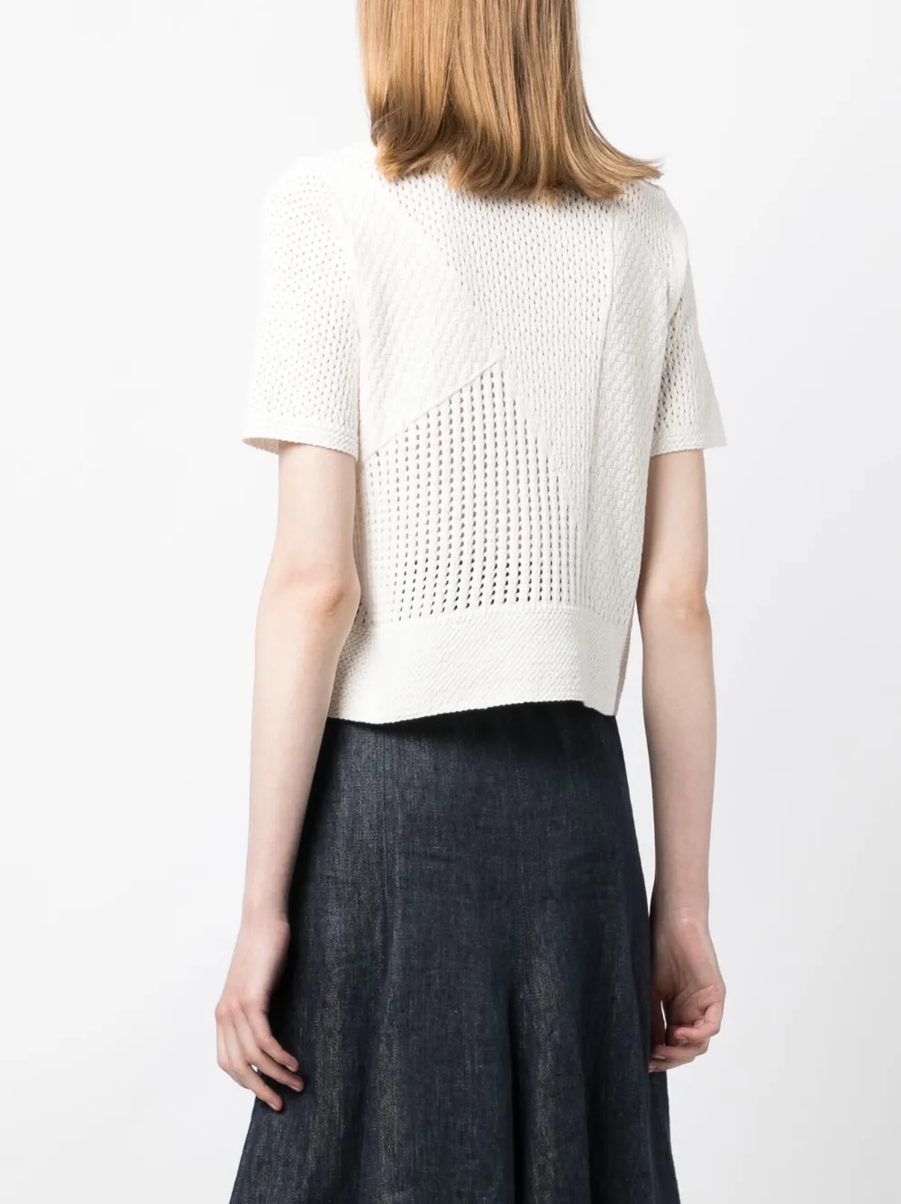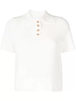 Bianco, cotone, design lavorato a maglia, colletto stile polo, falsatura frontale con abbottonatura e maniche corte.