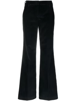 Blu navy, cotone, design a coste, vita alta, vestibilità gamba ampia, chiusura frontale nascosta, passanti e tasche a soffietto ai lati.