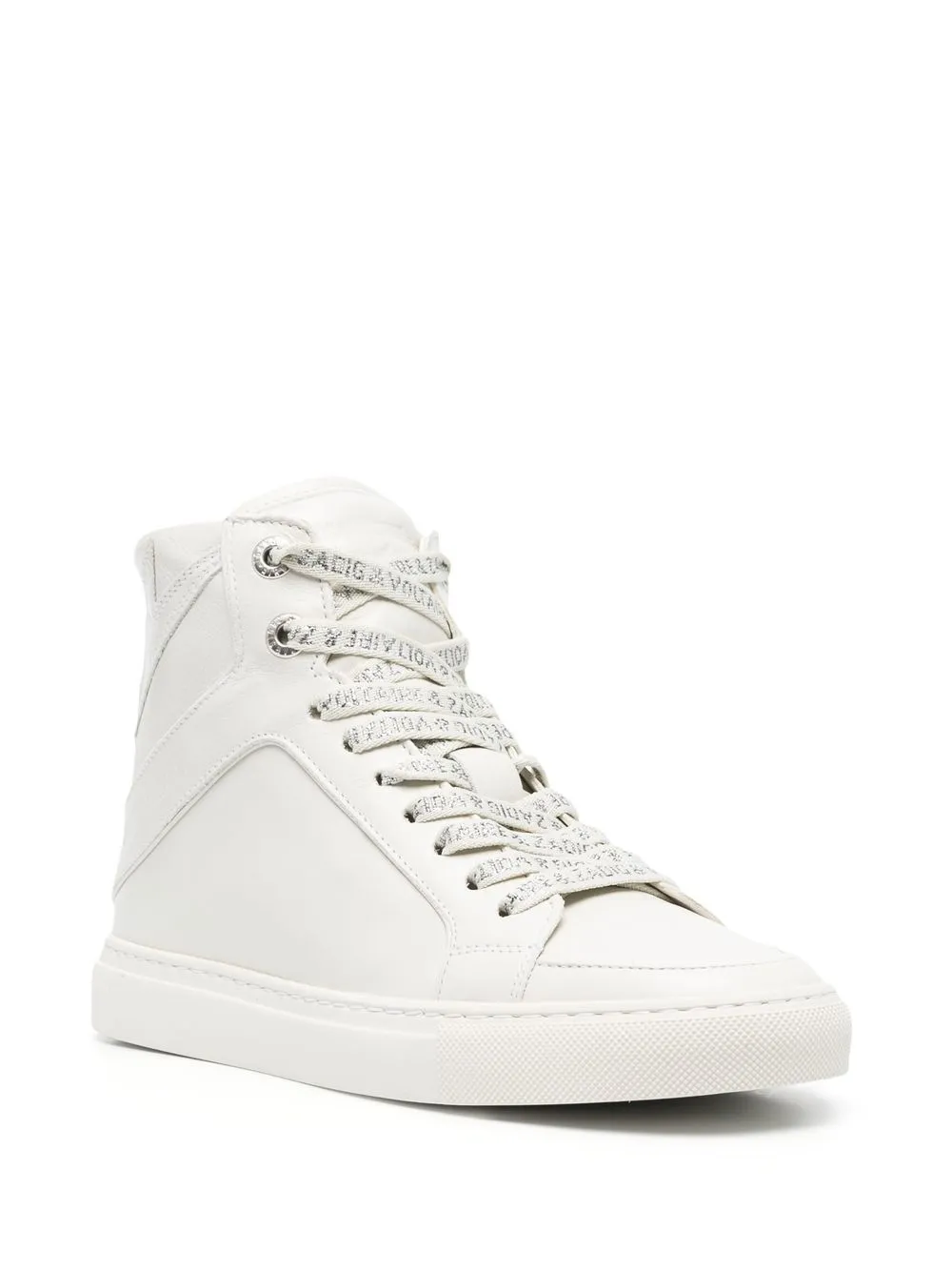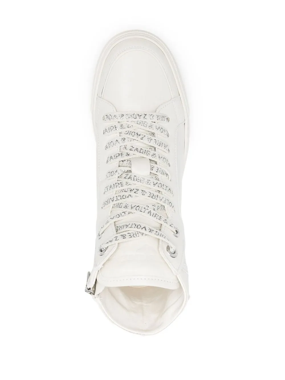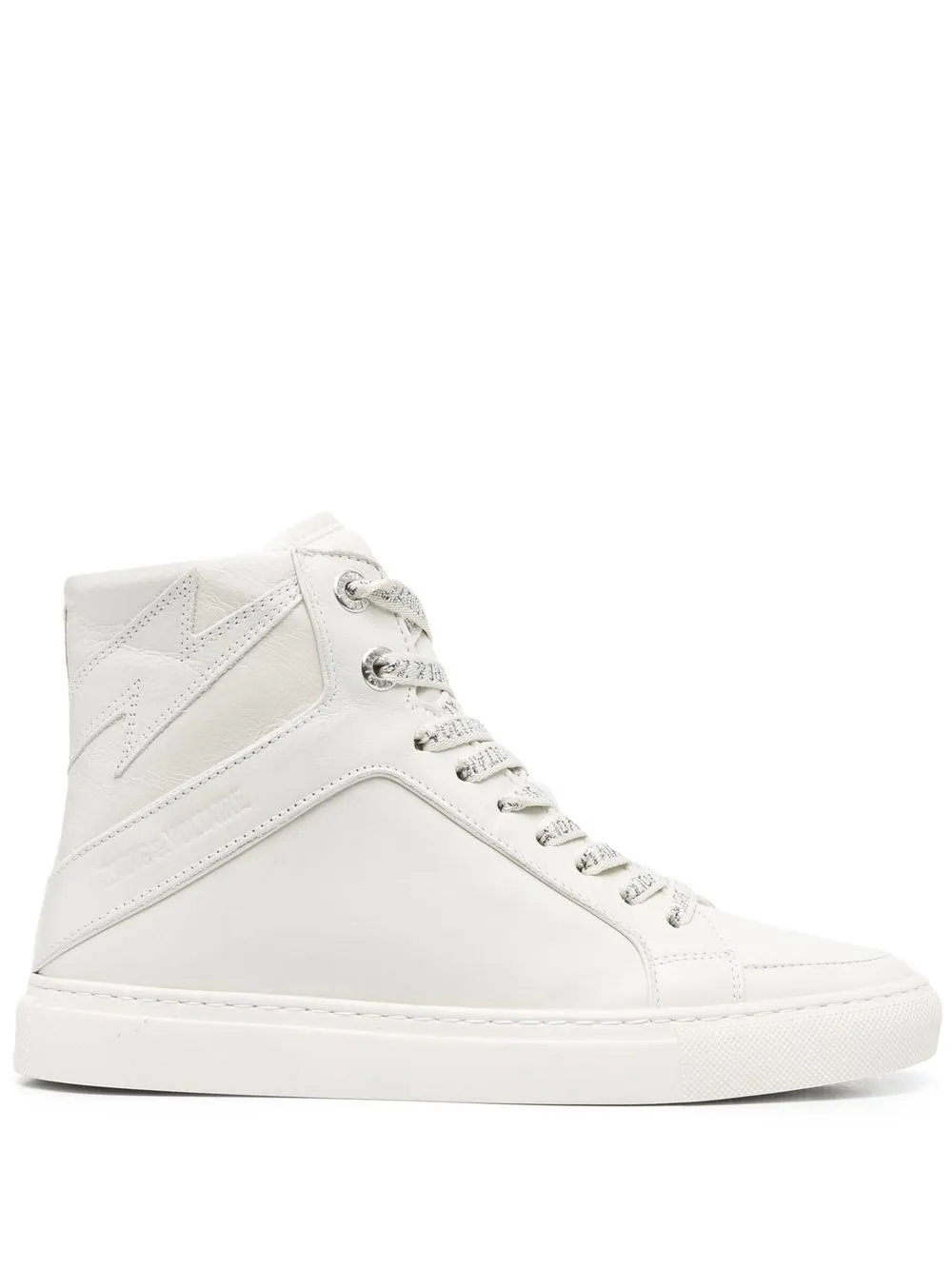 Bianco crema, pelle di vitello, applicazione posteriore con logo, cuciture tono su tono, linguetta con logo goffrato, lacci con logo stampato, punta tonda, chiusura frontale con lacci, chiusura laterale con zip, altezza alla caviglia e suola piatta in gomma.
